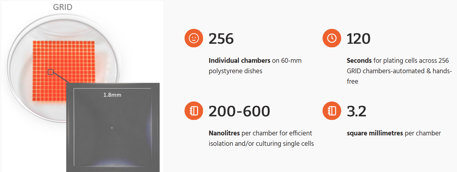 The isoPick automatically dispenses cells gently into GRID chambers and can flexibly transfer selected single cells into a range of different formats compatible with your downstream applications — including 96-well plates, PCR tubes, and vials for mass spectrometry. Importantly, optional temperature control and ultra-gentle handling of sensitive cells ensures high cell viability during cell isolation and transfer.After single cells are plated into GRID chambers they are imaged using the isoHub. Entire GRID chambers can be easily reviewed in the absence of optical edge effects typically associated with conventional culture plasticware. That way, you get absolute confidence in identifying chambers that contain a single cell. The isoHub also automates navigation through GRIDs and allows tracking of your selected clones, either using brightfield or fluorescent mode. What’s more, automated wireless data-transfer between the isoCell and isoHub guarantees a seamless and efficient workflow.